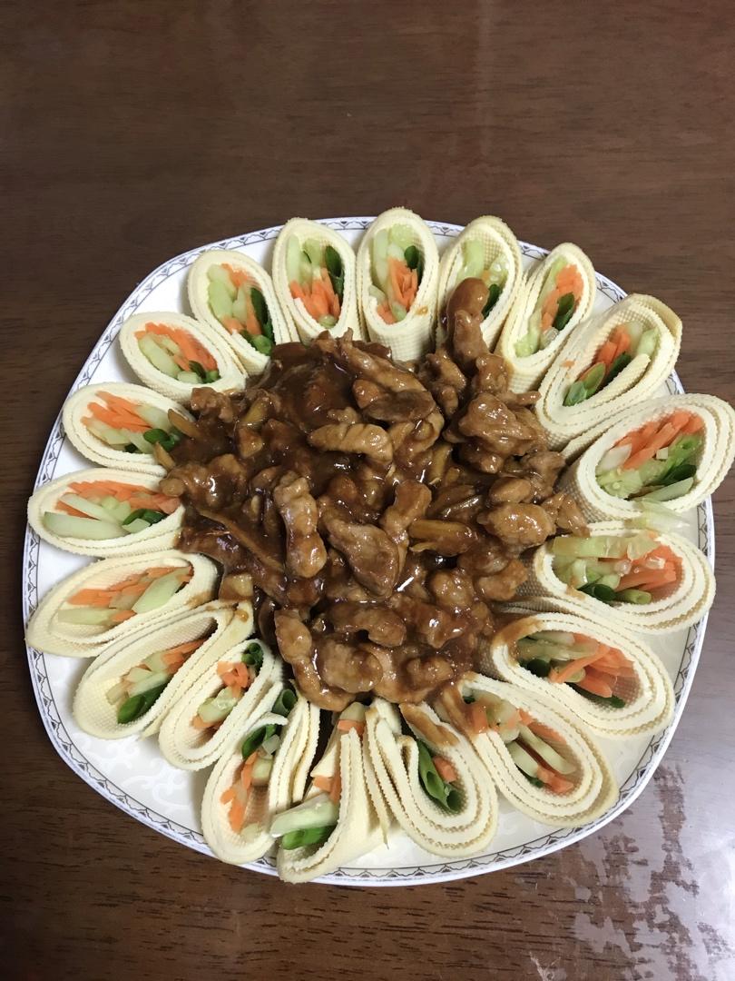 盘子小,但颜值高,将肉丝放到豆腐皮卷上,直接入口,省去吃饭时动手包的麻烦,非常感谢!