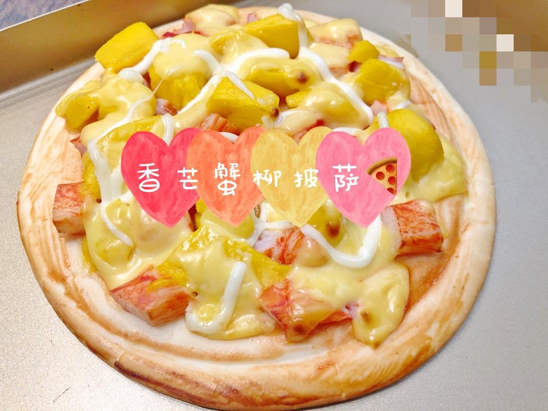 用了俏侬的饼底,番茄沙司打底,加蟹柳棒,新鲜海南芒果,表面撒芝士片(马苏里拉用完了),最后再淋一点点沙拉酱,完美