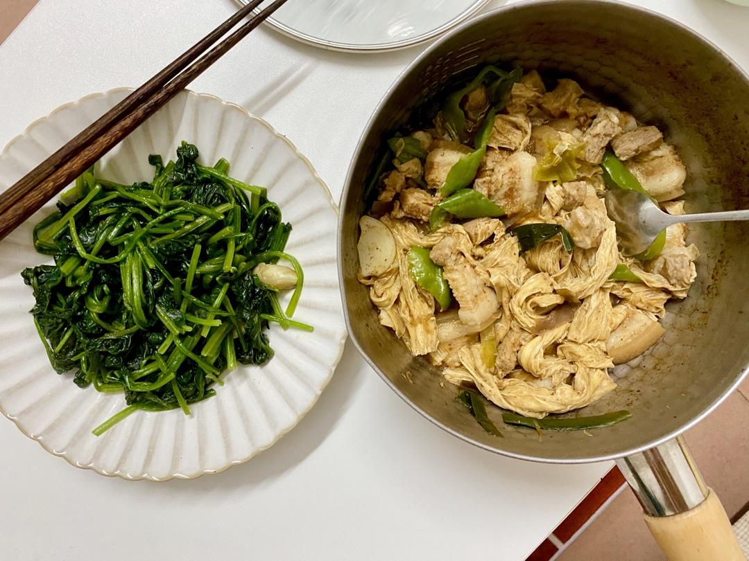 炒了一碟菠菜 腐竹焖五花肉肉