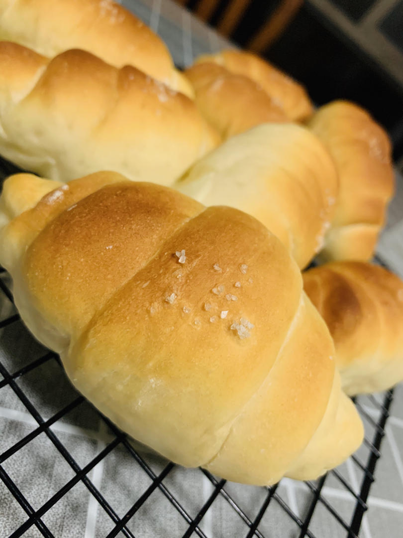 Annawo 做过 【视频食谱】错过一定后悔的日式盐面包 一直心心念念要做的咸面包,买了把新刀,于是算准时间安排了。提前一晚液种做好,第二天开工,擀卷开始真的崩溃,完全不知道是个啥,越往后就顺手多了,整形还算过得去,小小一个,感觉一次2个不在话下,没有蒸汽,趁热吃外皮是脆的,待冷了只有丁点硬,内里很松软哦,赞的 2020-07-17