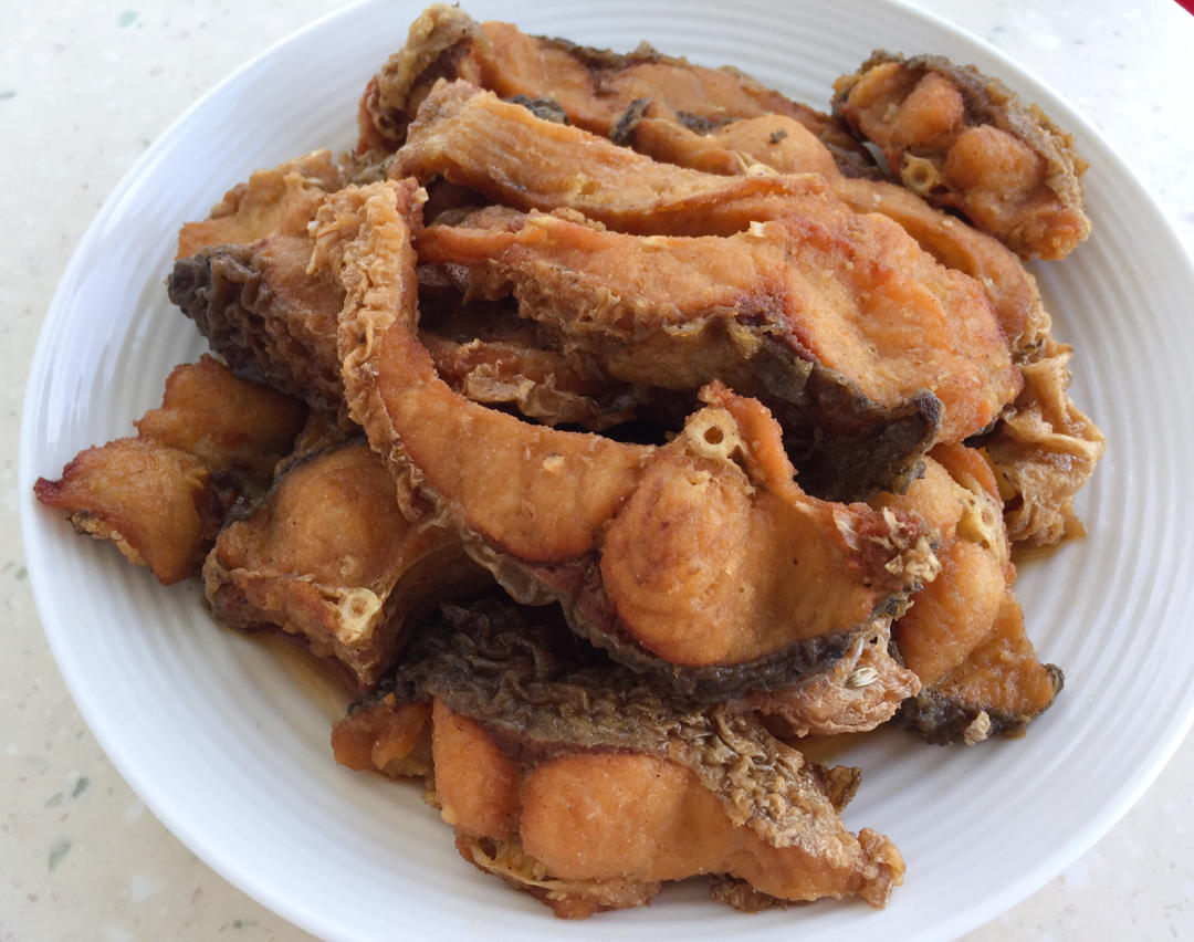 3、腌好的鱼用厨房纸巾吸干水分,防止炸鱼的时候爆锅。油温6成热放入鱼块开始炸制,鱼块放进去先不要动,否则会碎,也不要放太多,会粘连在一起。炸至一面定型后翻面继续炸至金黄捞出。然后把油温加热到7成热左右,放入鱼块复炸后捞出,复炸后肉质会更紧实,更有嚼头。