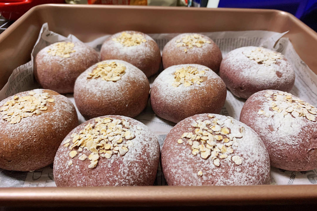 阿简私厨 做过 全麦芋泥欧包 参考本方子调整了下:1,200g黑全麦粉,100g高筋粉2,没有红曲粉,用了紫薯粉3,加入了约15g的椰子油4,牛奶用了约200ml(根据面团吸水情况)5,芋泥紫薯蒸熟捣成泥,加入一点点牛奶至不太干就行,不加糖6,包好馅儿放入烤箱关上门二发约20分钟(放置烤箱不做任何操作)总结:紫薯芋泥馅儿有点点少,不加糖的面团和不加糖的馅儿,没有甜味,不那么好吃,但因为加过椰子油(来自一个健身人士尽量少吃二次糖油混合物的倔强),所以不再另外加糖了,喜欢甜的可以适当加糖,用代糖负担小一些。 2020-10-09