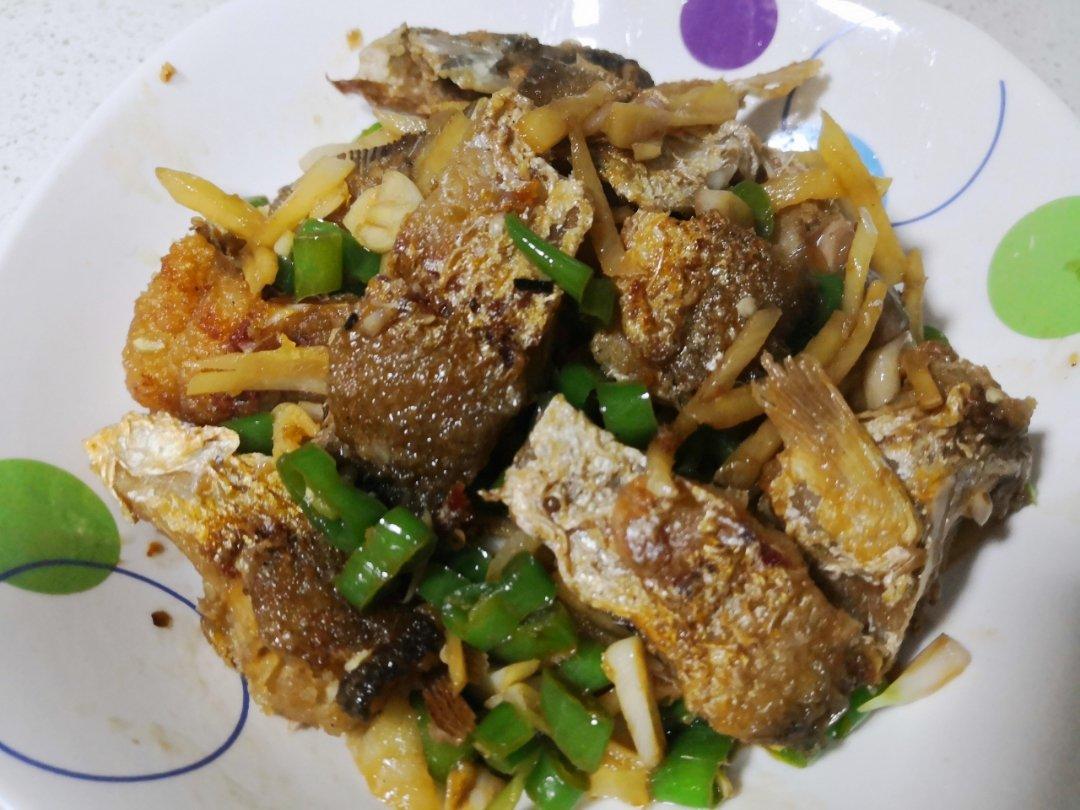湘兵哥哥 做过 晚餐•2020年10月29日 红尾鲴一尾,切块,用盐腌制30分钟;仔姜切丝,青椒切圈,蒜切末。鱼块用山茶油小火煎炸两面黄并熟透,盛出备用;另起锅倒山茶油大火烧八成热,下姜丝、青椒、蒜末翻炒断生,鱼块重新下锅,放适量生抽、蚝油、鸡精和少许开水,翻炒至汤水收干出锅。#晚餐•2020年10月29日# 2020-10-29