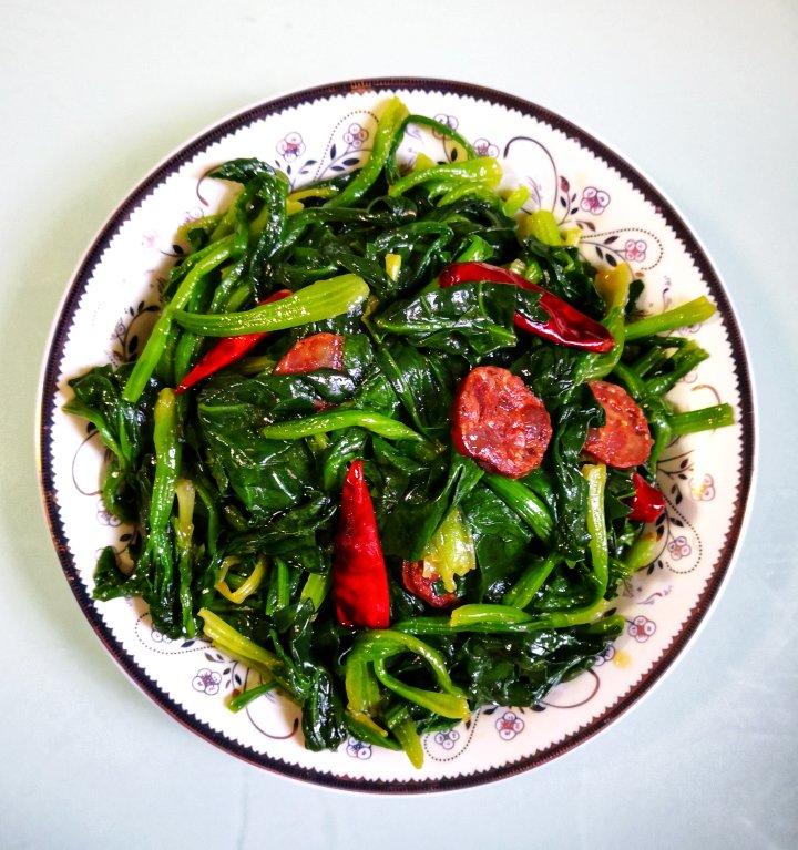 海洋999 做过 菠菜炒腊肠 冷锅下油,爆姜片、蒜沫、葱花、干辣椒,待干辣椒稍有变色,加入贵州腊肠片翻炒,烹入少量料酒,加入焯好的菠菜,洒一点儿盐、蚝油、少许白糖,用筷子、炒勺翻炒(颠大勺不行!焯水后的菠菜粘连),最后撒入鸡精,点一点儿香油,起锅,装盘。 2021-01-20