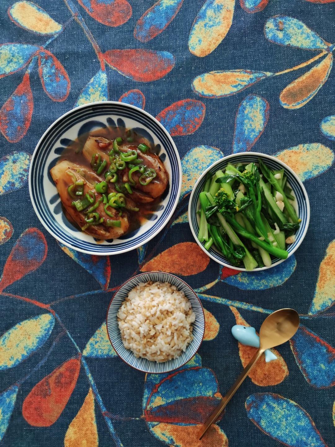 蒲烧茄子+蒜蓉菜心+燕麦米饭,20210302周二午餐。