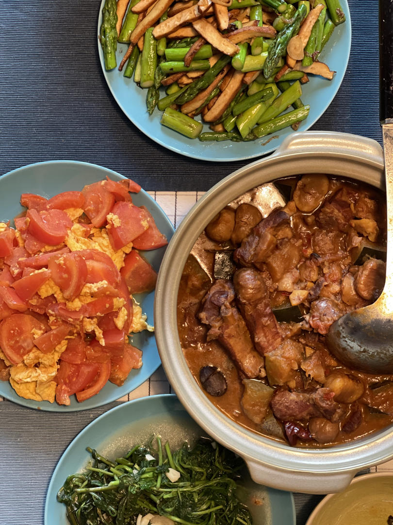 r475 做过 炖菜不都一个样 为了冰箱里一包排骨配了一桌。冬瓜板栗和肉都放高压锅里焖煮,春天芦笋鲜嫩切了豆干炒了,出锅时淋了一点high ball。绿叶菜也随便炒了个枸杞叶,太容易出水了。#炖菜不都一个样# #晚餐•2021年3月21日# 2021-03-21