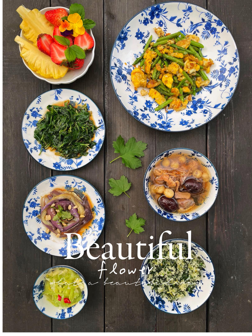 早安。水果;马兰;拌茄子;莴苣笋丝;芦笋鸡蛋;老鸭汤;莴苣叶炒饭