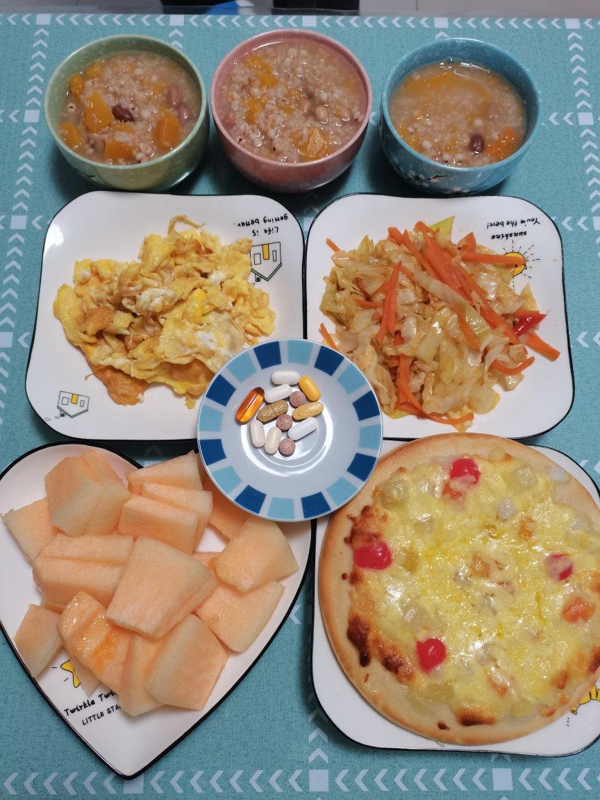 南瓜杂粮粥,跑蛋,酸辣白菜,水果披萨,哈密瓜,营养素
