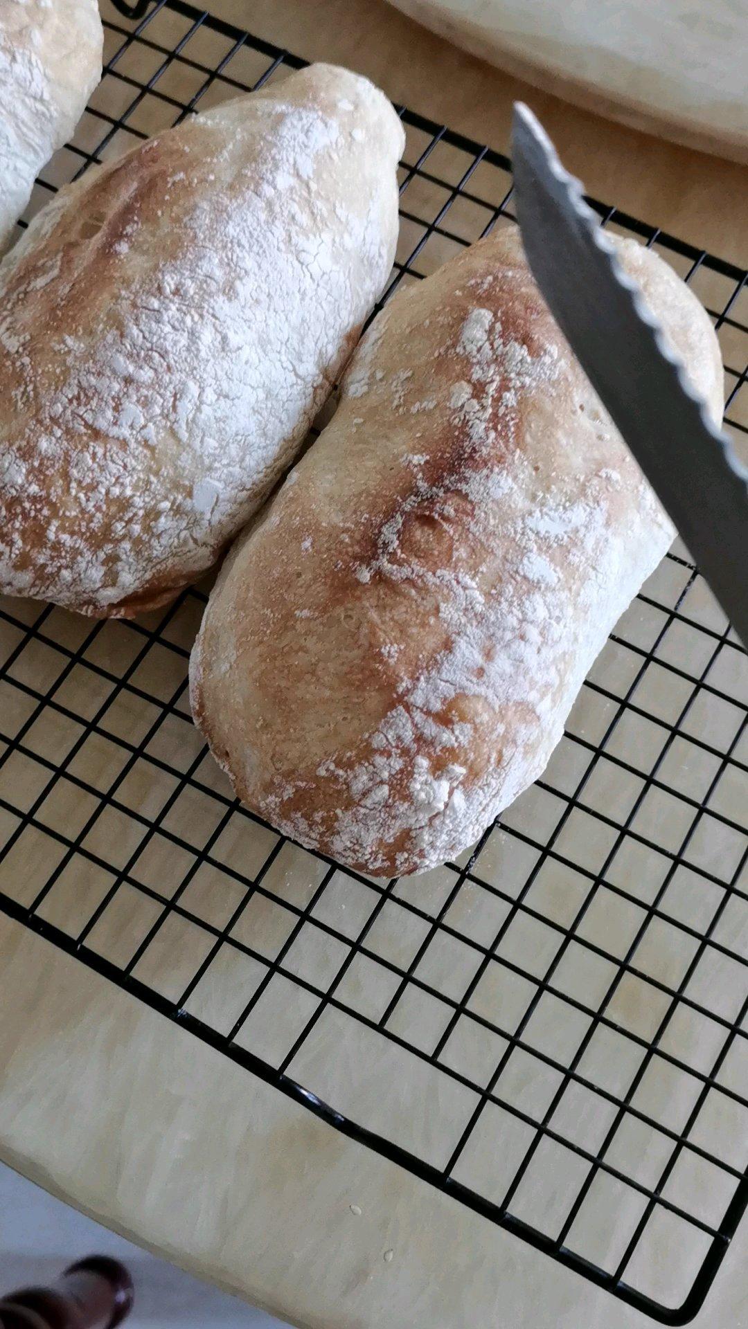 Ellis么 做过 零机器免揉|徒手做出漂亮大气孔欧包|恰巴塔Ciabatta 第一次做恰巴塔,家庭烤箱只有230℃,烤不出均匀好看的黄褐色,烤时间太长又怕水分流失,就拿出来啦,气孔也不错 2021-06-22