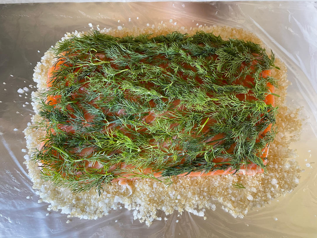 ElisaaJiang 做过 Gravlax 杜松子酒百里香腌三文鱼 #午餐•2021年7月5日# 上一块腌好直接被婆婆切走了一半,今天又腌了一块。传统配方,750g三文鱼,150g盐,100g黄糖,15g莳萝。 2021-07-05