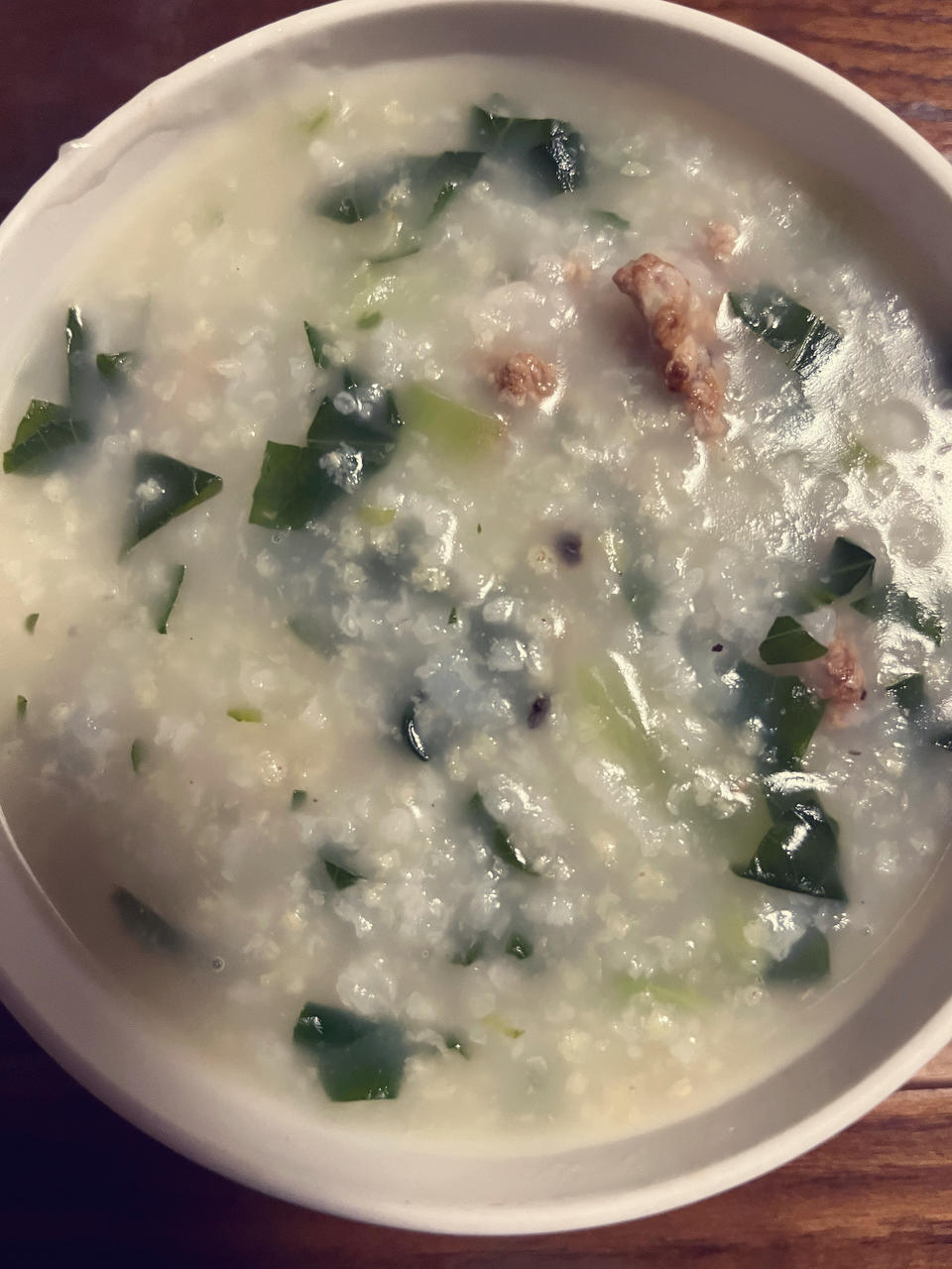 喜由心来 做过 晚餐•2021年10月25日 #晚餐•2021年10月25日#青菜肉末粥。大米小米同熬,起花时加肉沫,最后是青菜 ,盐、姜末、黑胡椒。以往做这个是炒肉末青菜,加米饭加水煮。今天的这个是粤式生滚粥方法,觉得不错。 2021-10-25