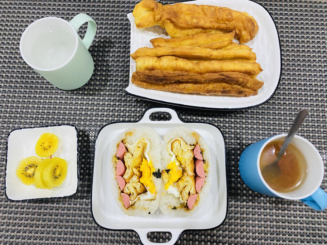 🌸自制小油条+香肠鸡蛋萝卜条牛肉松海苔糯米饭团+猕猴桃+蜂蜜柚子茶#早餐•2021年11月11日#