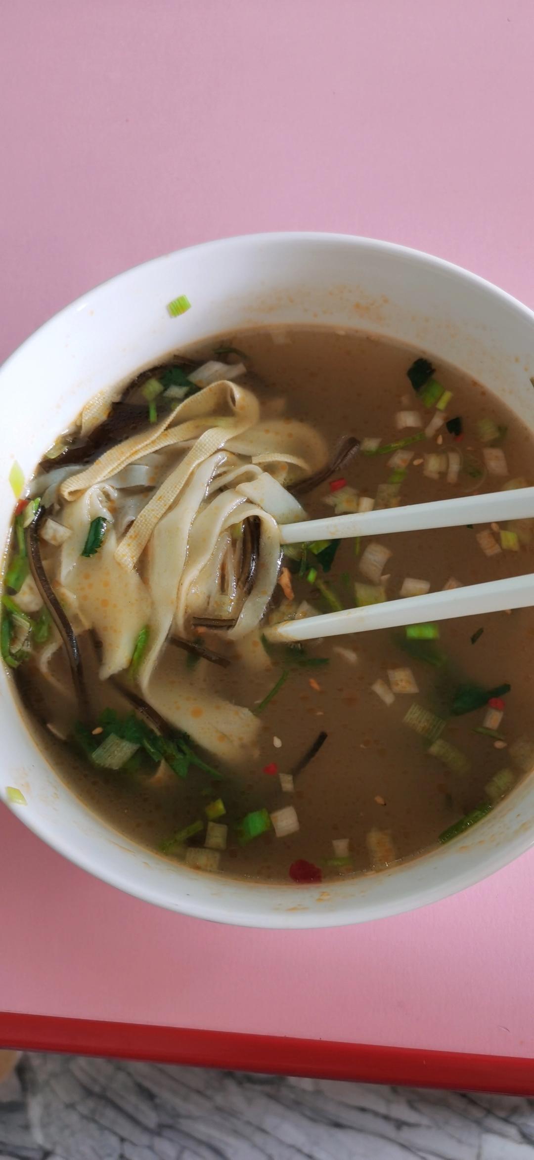 澈儿_radk 做过 2022年02月23日 牛肉或羊肉,去血水,炒一下,加入沸水,姜,炖肉料包,中大火煮,10分钟转中小火,慢炖,碗里放入盐,鸡精,香油,馄饨汤料,蒜苗,海带,浇上肉汤,下烩面豆腐皮,生菜,放入碗中,最后加入香菜 2022-02-23