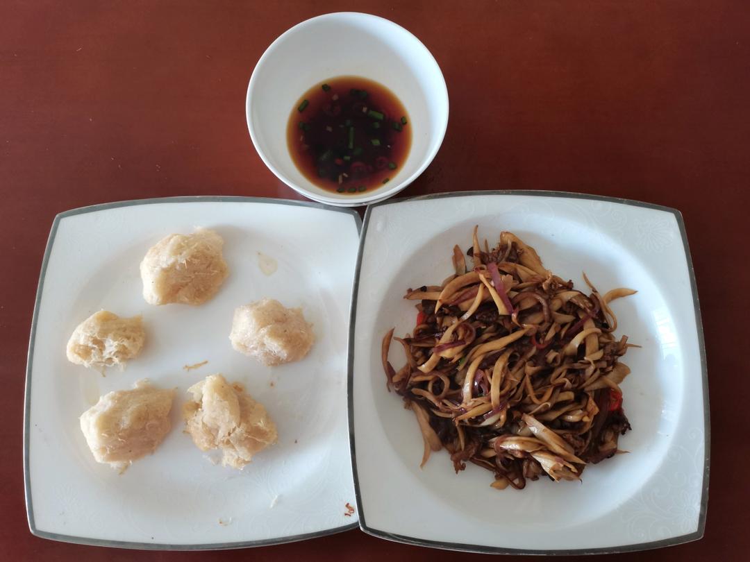 2.锅热放油,油热后加入杏鲍菇丝,炒至变软后加入葱粒蒜粒辣椒圈洋葱丝,炒熟后加入生抽耗油调味上色即可