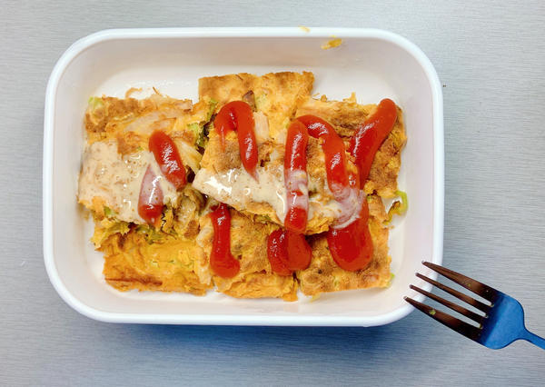 昨天睡前切了细细的洋葱青椒香肠泡菜丁,一颗鸡蛋,两勺面粉,一勺辣酱酱油,捏一捏糖,今早随手一煎,就很美味啦