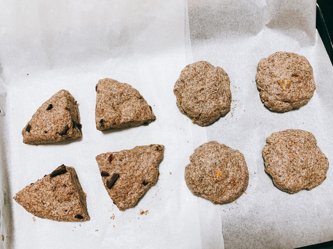 小小小雪莉吖 做过 黑全麦司康 100g黑全麦粉,3g泡打粉,1g盐,参与配料(我用的黑巧克力+蔓越莓干,红茶粉+无花果干),加75g左右牛奶,搅合搅合把混合物软软的捏成团,最后刷蛋黄液,烤箱180°20分钟就好了!(4块的量)超方便!无糖无油超饱腹#黑全麦司康# 2022-04-10