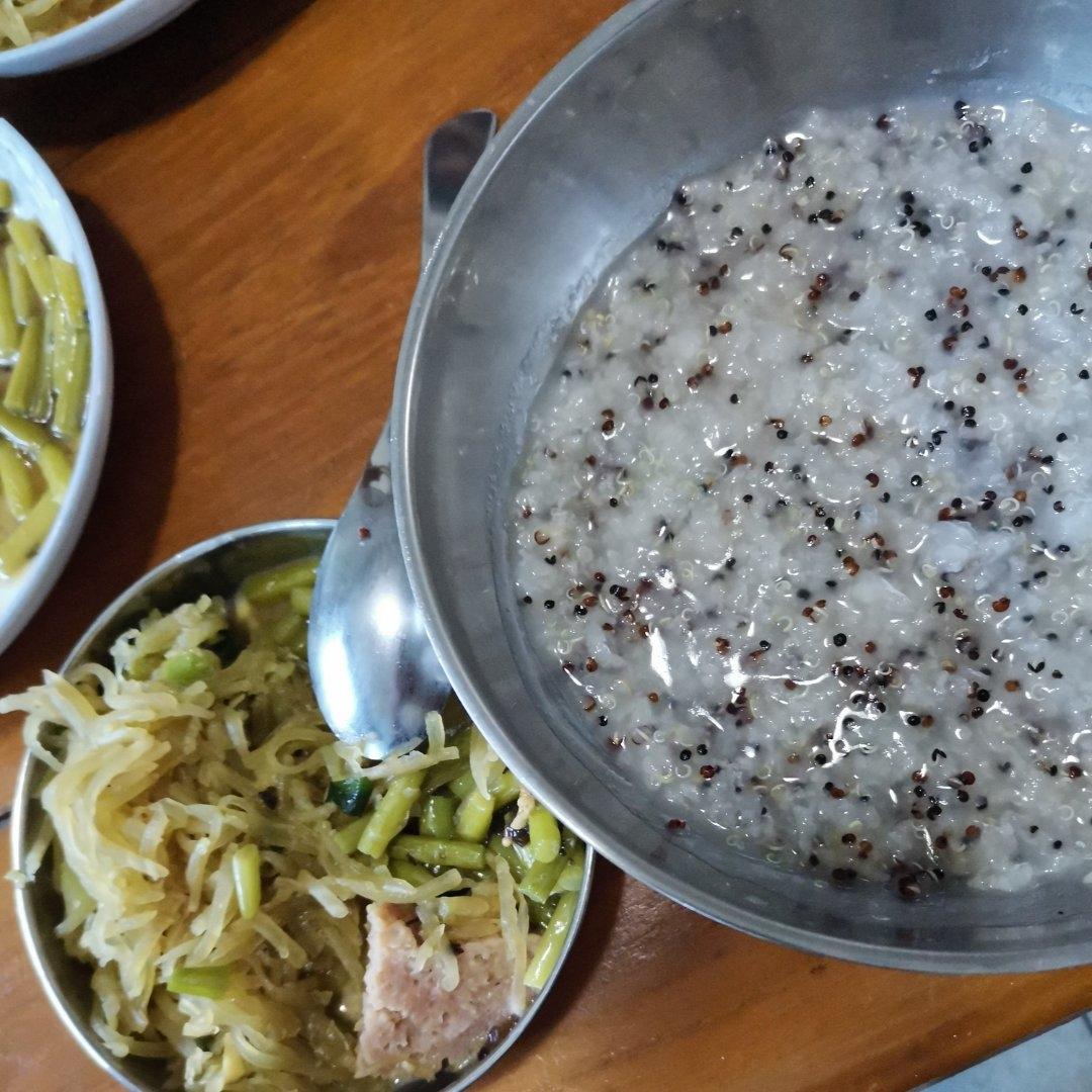 黎麦大米粥,莴笋,蒸肉