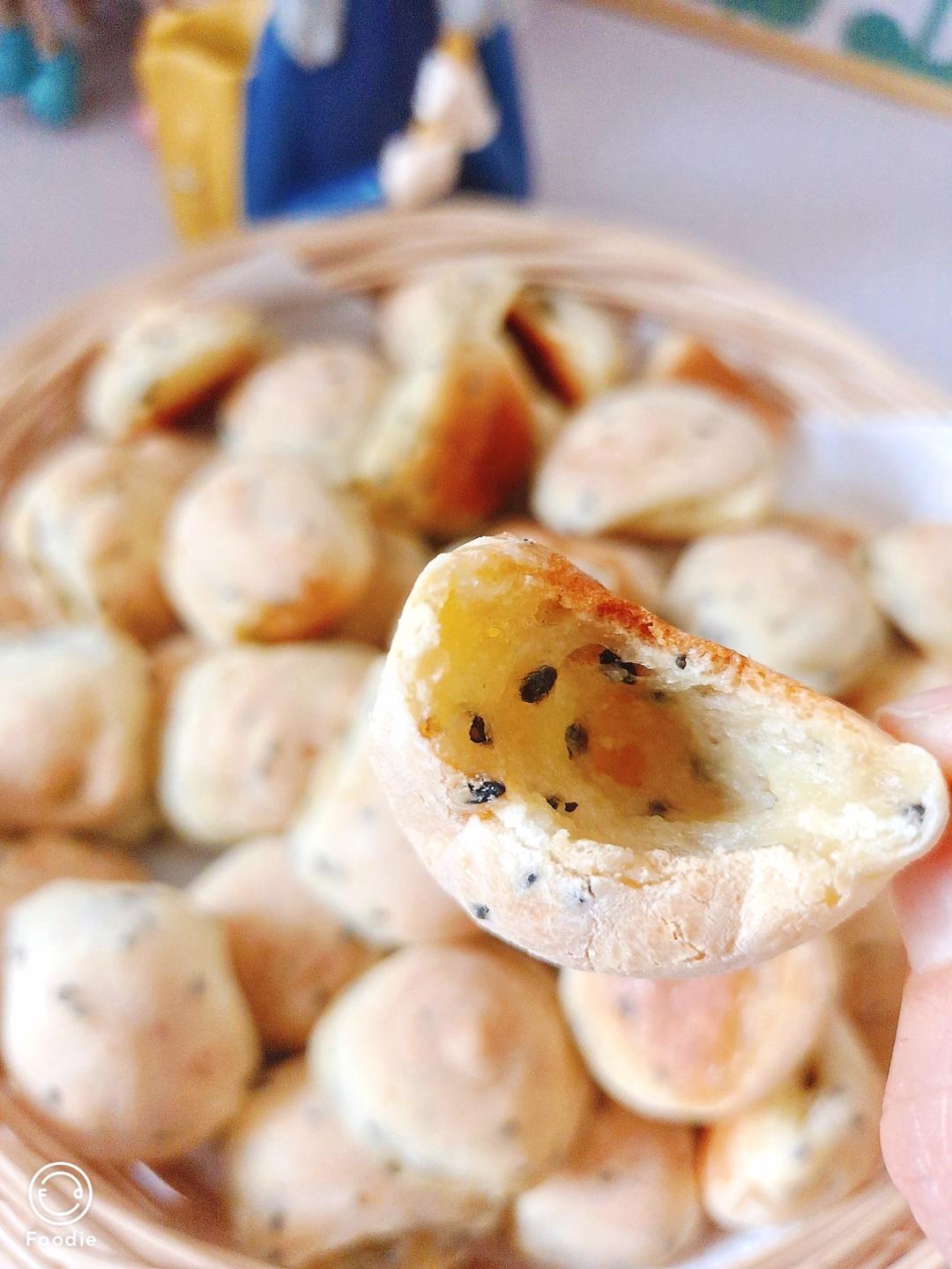 材料:1、牛奶100克 2、糖15克 3、黄油25克 4、高粉20克 5、木薯粉90克 6、鸡蛋2个 7、黑芝麻 若干 8、裱花袋1个