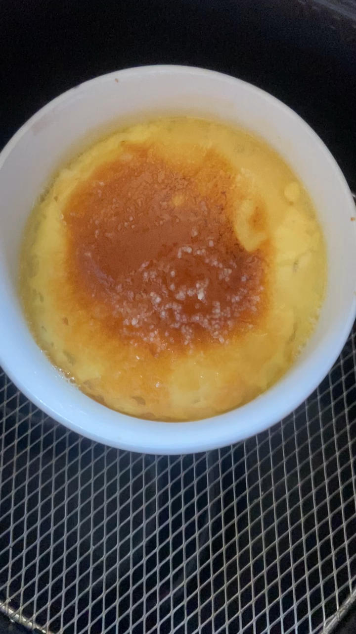 Mademoiselle_Yin 做过 2022年05月03日 疫情中的下午茶:焦糖布丁原料:牛奶:240ml白砂糖5克(3克加入牛奶,2克做焦糖)鸡蛋2只步骤:1.牛奶中加入糖,加热至糖融化。(牛奶不能加热过热,否则第二步就没办法完成了。)2.鸡蛋打散,用筛网过滤后加入牛奶中,搅匀。3.将混合液放入空气炸锅中,设置200℃烘5分钟,拿出可以看到基本成型了,撒上白砂糖,继续烘烤5分钟200℃,就完成啦! 2022-05-03