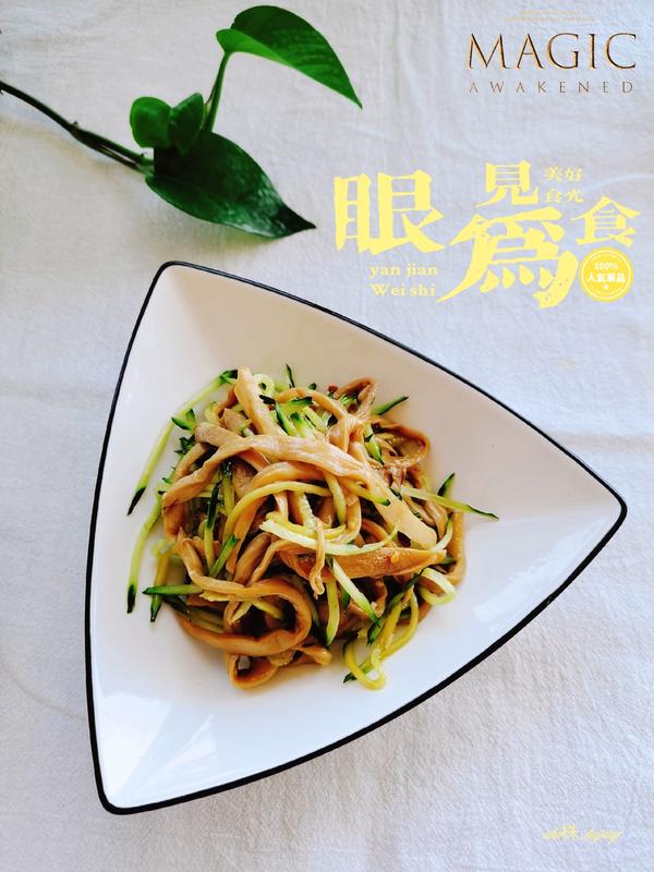 杏鲍菇蒸熟撕条挤干水分,放芝麻、蒜末、一点点辣椒粉,滚油浇上去滋啦一下,再淋上由生抽、鸡汁、花椒油、白糖等结合在一起的料汁,加上黄瓜丝即可。