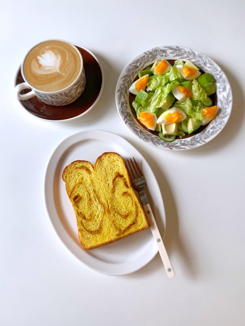 🌧️大家周末早呀!今日早餐:双倍南瓜吐司(🎃板栗南瓜)鸡蛋沙拉🥗,咖啡。