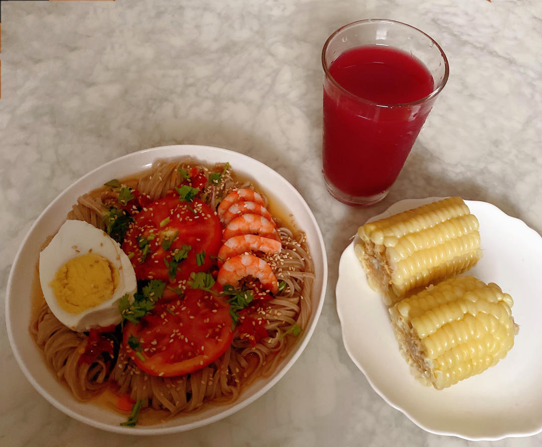 百味厨娘 做过 7月早餐马拉松 #早餐•2022年7月3日# 盛夏,用荞麦面做的冷面,搭配这自己调配的酸甜凉拌汁淋面,唏哩呼噜的就把这一大盘吃完了,口感很清爽,再搭配上食当季杨梅汁,清凉一夏[呲牙] 2022-07-03