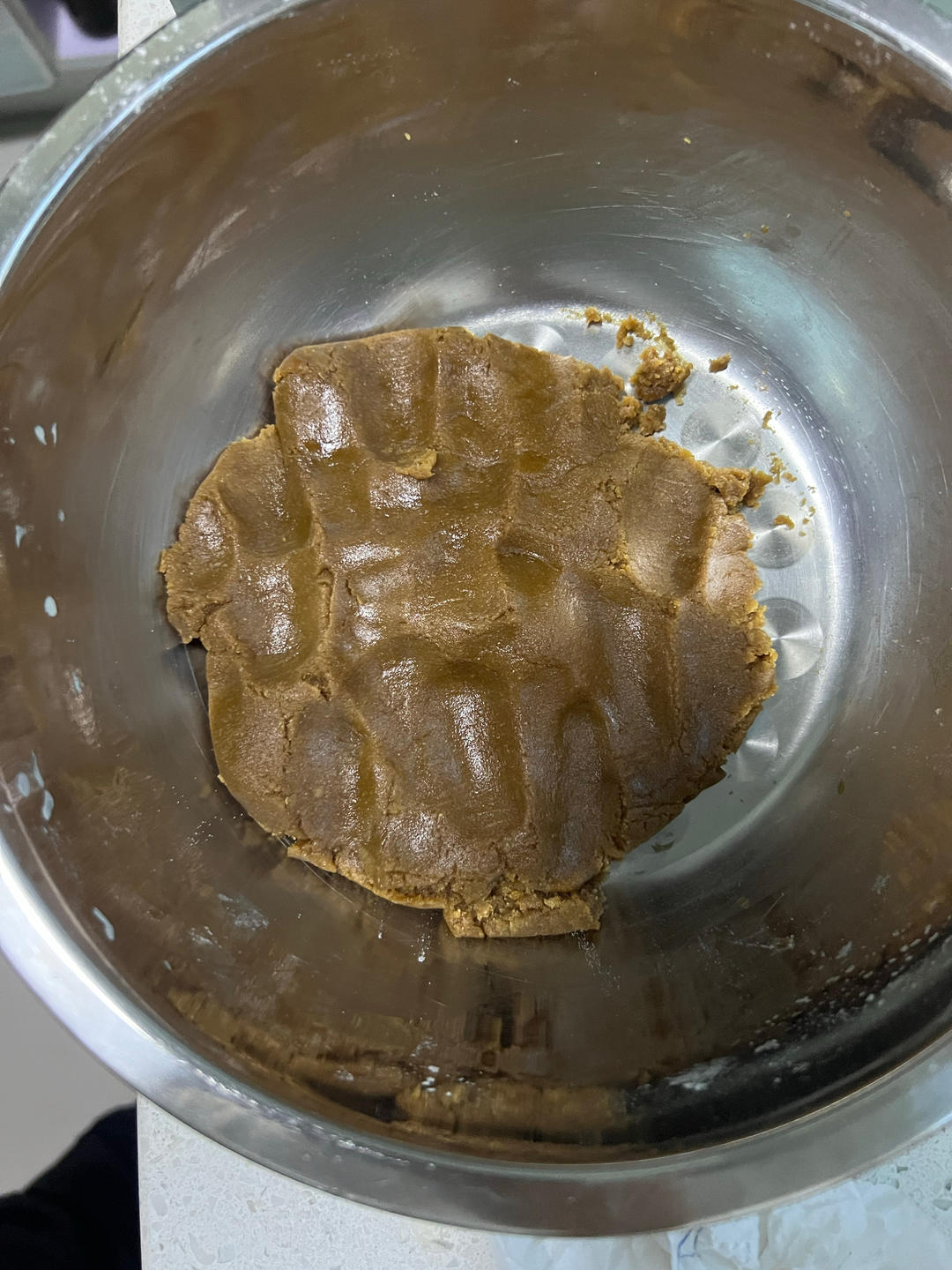 先把糖浆 花生油 碱水混合均匀,面粉过筛,用刮刀拌匀,揉成面团,醒发一会。