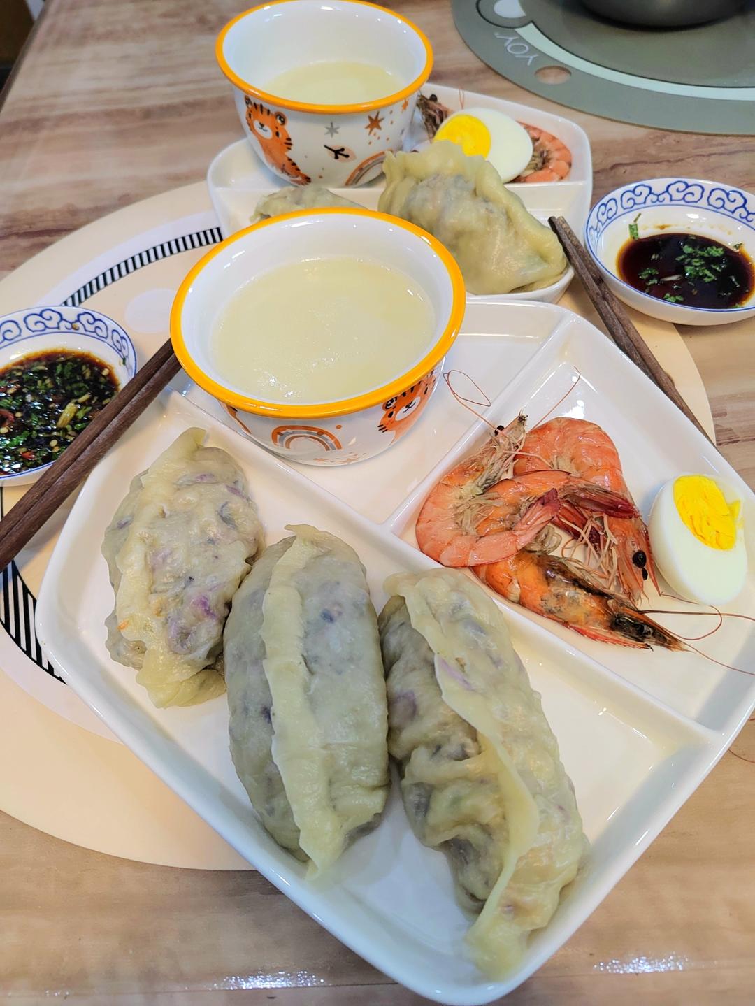 无糖豆浆,薄皮大馅的素馅蒸饺