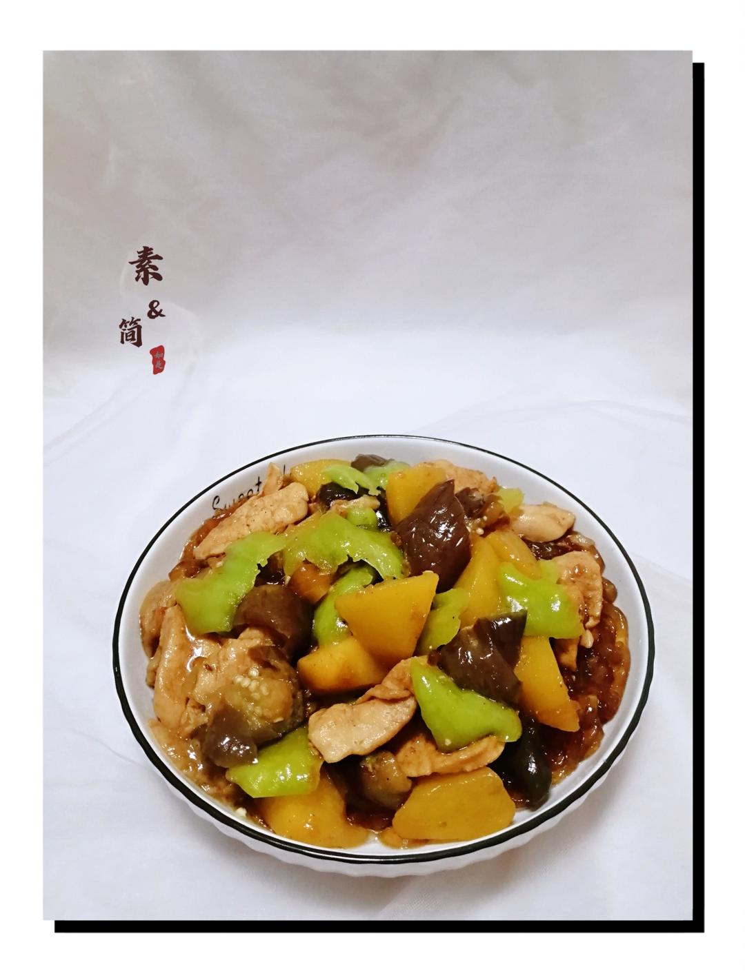 土豆茄子尖椒肉片粉条。