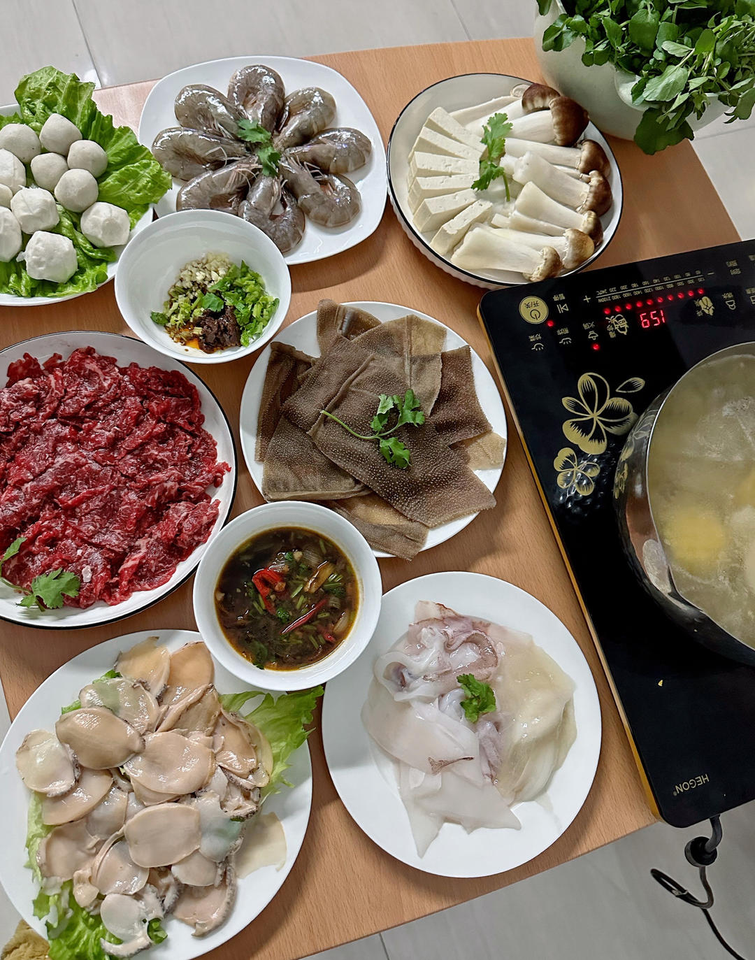 Y亚亚御膳房 做过 晚餐•2023年1月25日 两人火锅(吊龙雪花,鱿鱼,虾,鱼丸,墨鱼丸,牛百叶,鲍鱼,豆腐,姬松茸,西洋菜)鸡脚白萝卜玉米汤底#晚餐•2023年1月25日# #两人·食# 2023-01-25