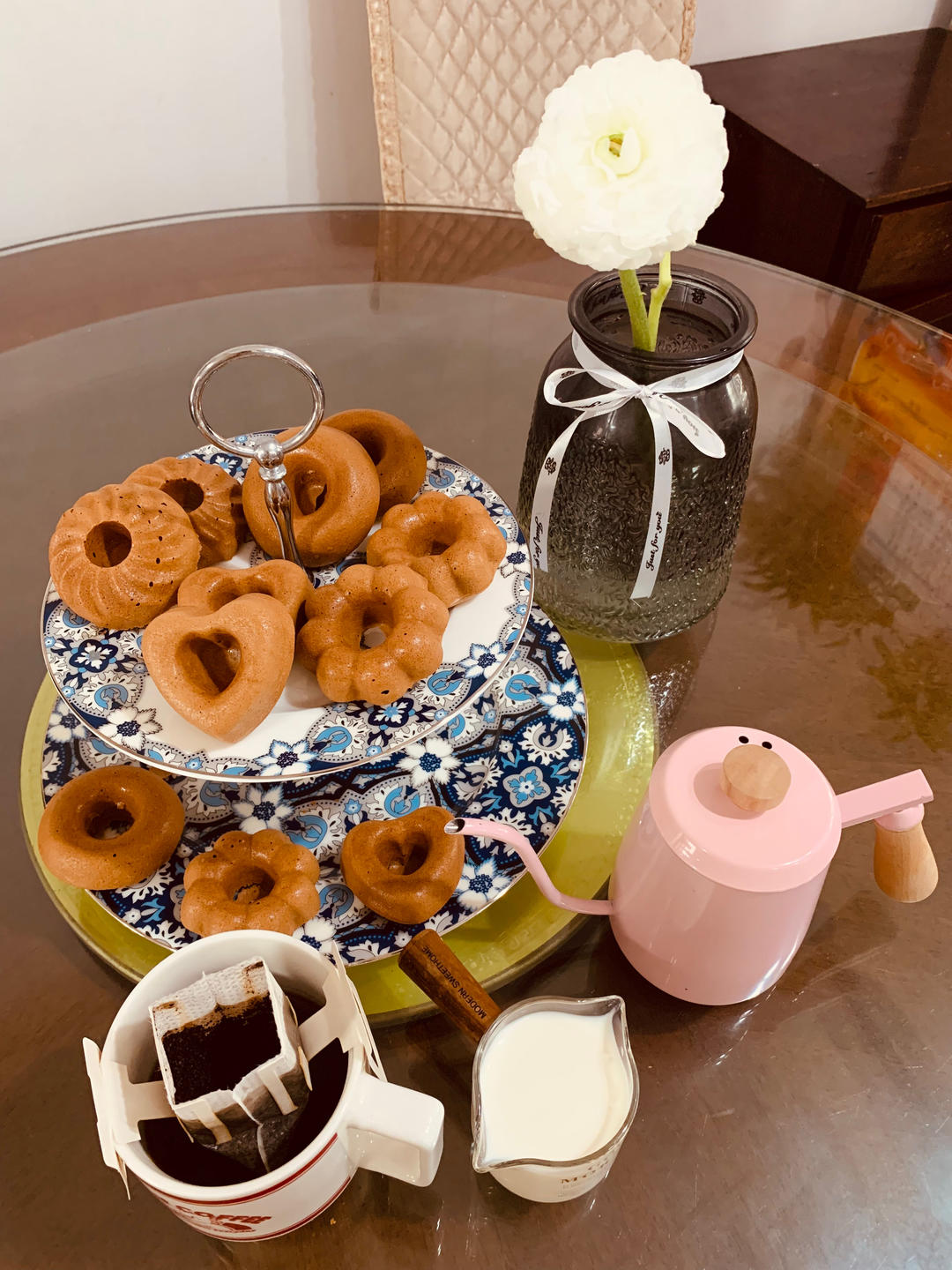 加了可可粉的巧克力甜甜圈🍩蛋糕,刚出炉的口感好极啦👏🏻搭上咖啡☕️妈咪大人也忍不住夸赞起来👻