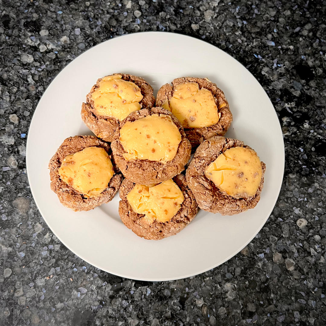 发现冰箱里大半盒小三角奶酪快要过期了,就想着做点什么把它们一次性消耗光。想起经常看到的网红冰乳酪司康,但是手头没有鸡蛋,于是灵机一动用好时巧克力酱代替了(正好也要到期了😅),随心所欲改了配方,从产生想法到送进烤箱只花了20分钟🤣