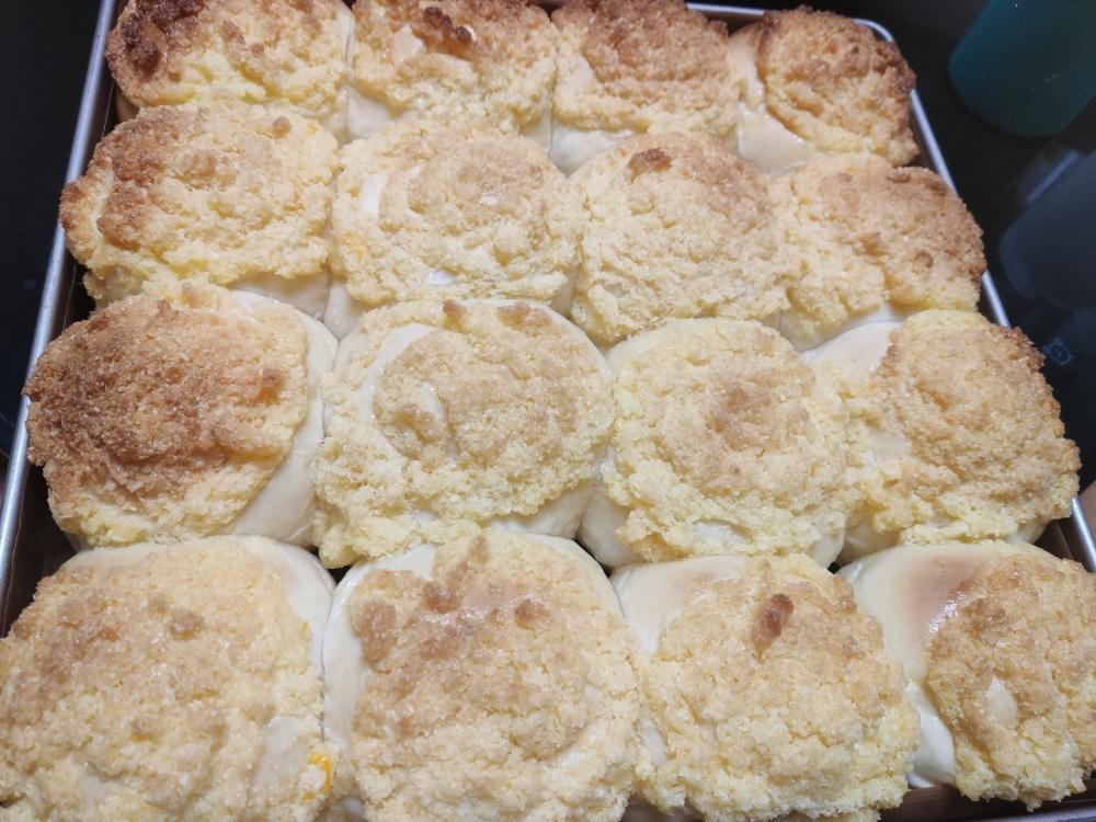 晚上十二点多出炉,直接让它在烤箱里过夜了。还好还是很松软,早上复热了当早餐。