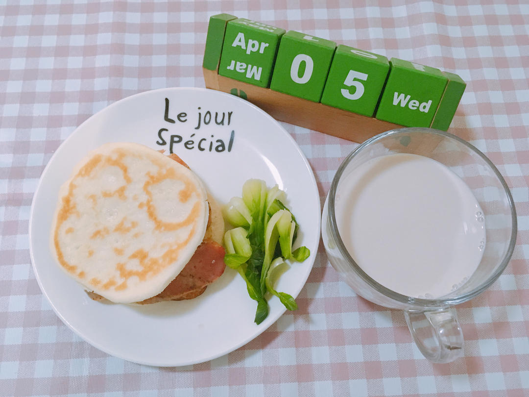 G6S2.W8Day3.烧饼夹煎蛋🍳并黑椒烤肠搭油麦菜配核桃乳