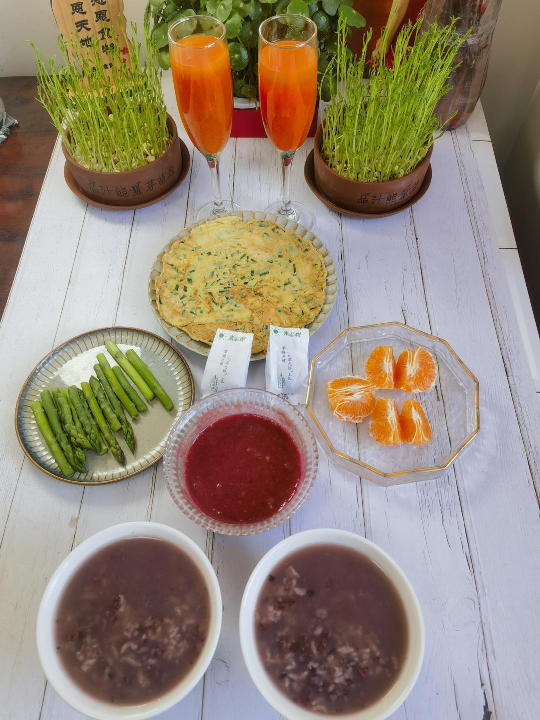 习云 做过 家庭食育师 20230502营养早餐我的枸杞原汁&沙棘原浆先生的枸杞原汁芝麻丸我的健脾祛湿糊五珍粉+山药粉+甜菜根晶先生的杂粮粥酵素有机大米+紫糯米糙米+青稞米先生的韭菜鸡蛋饼白灼芦笋沃柑#家庭食育师# #营养早餐# 2023-05-02