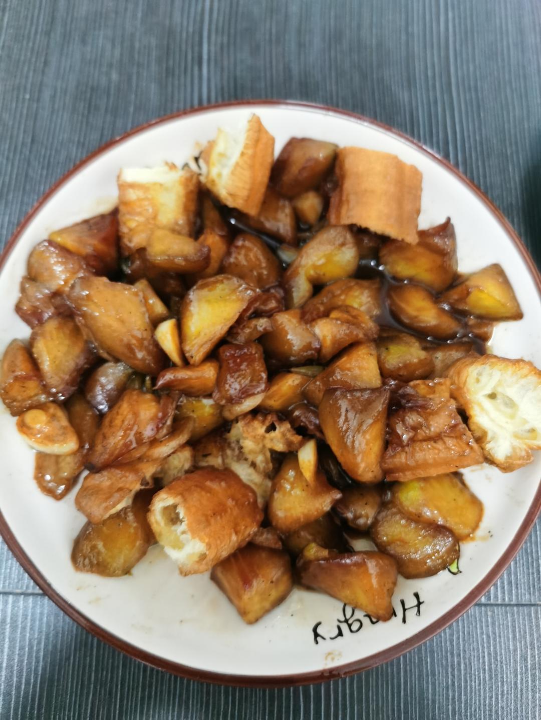晚饭红烧茄子,早上买的油条剩了半根,出锅前切吧了切吧一块拌了
