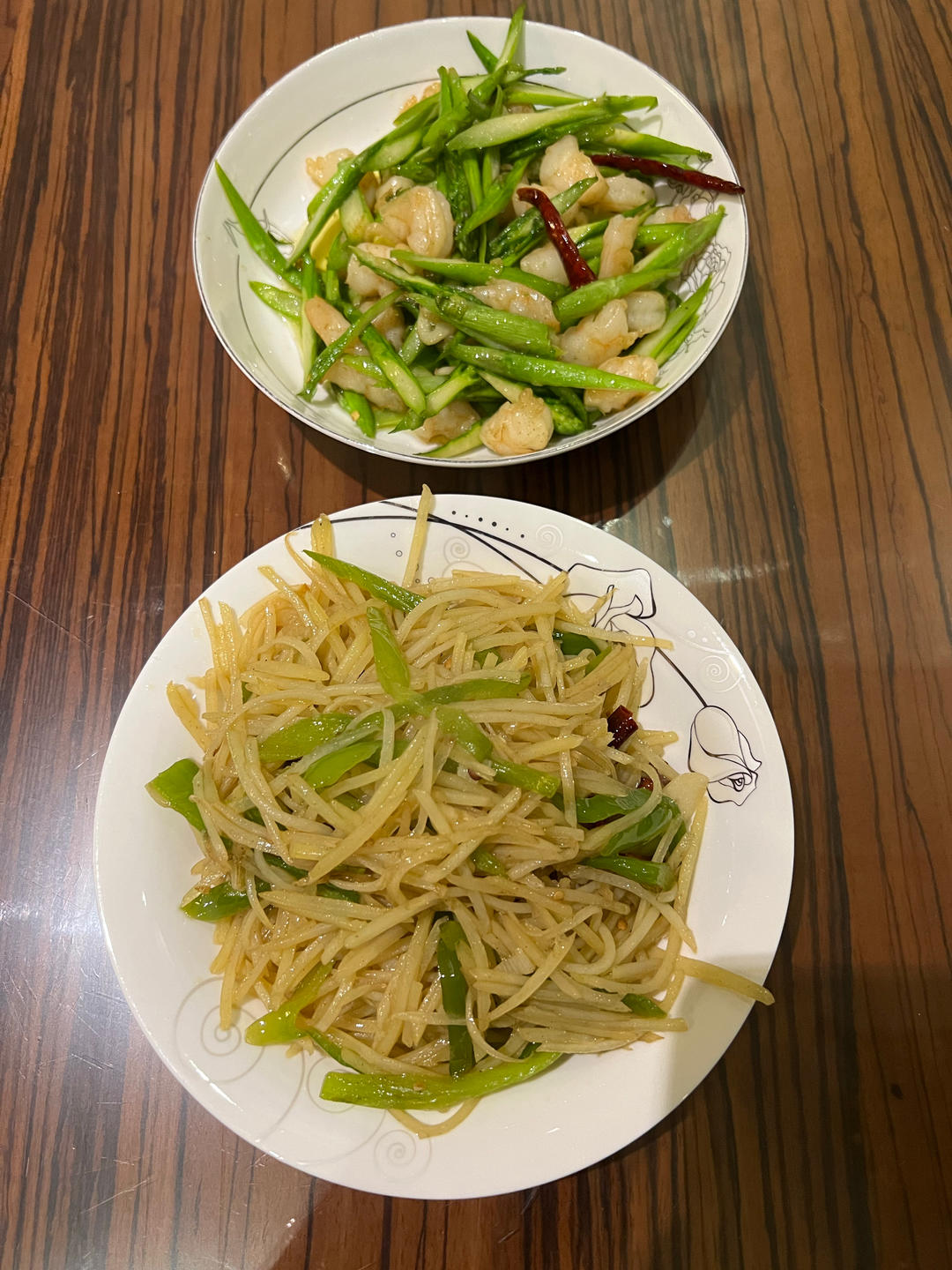 酸辣土豆丝,芦笋炒虾仁。