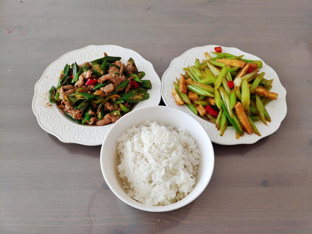 秋葵炒肉 芹菜炒豆腐 米饭🍚