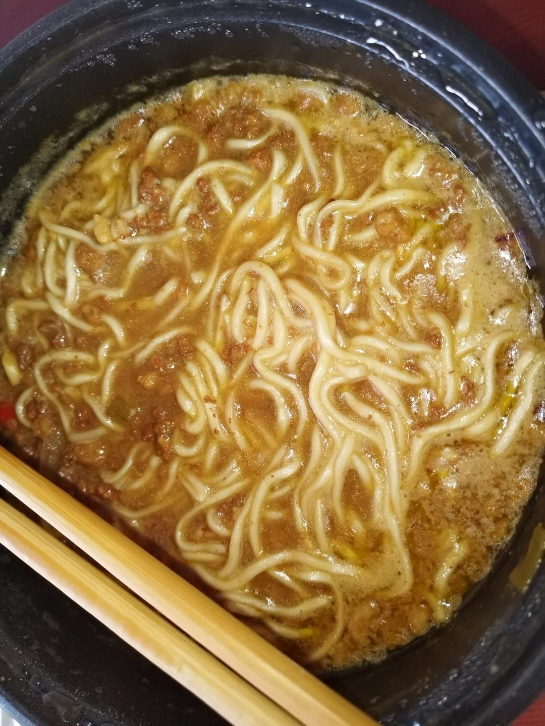 肉酱面。拍的好没有食欲啊,其实味道不错的。早上上班让大雨给拍了,全身包括鞋都湿透了😭
