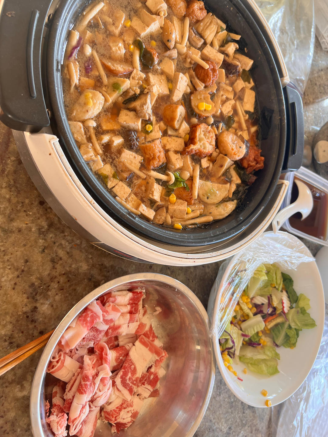 寿喜锅一定要配肥牛,各式日本寿喜锅鱼丸,香菇,,日本酱油,柴鱼片,海带芽,和肥牛