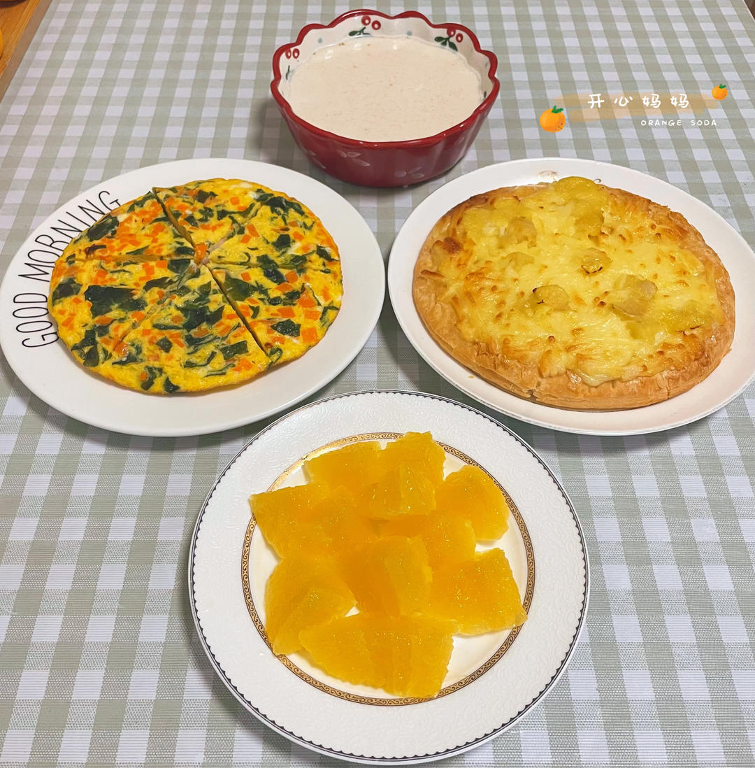 今早吃山药粉牛奶,裙带菜虾仁鸡蛋饼+千层榴莲披萨
