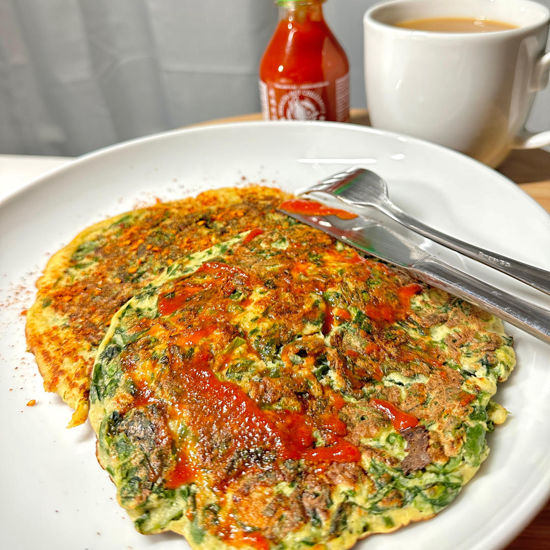 难得做个中式早餐。材料是黄豆面,菠菜,鸡蛋,车前子壳粉,泰式甜辣酱…