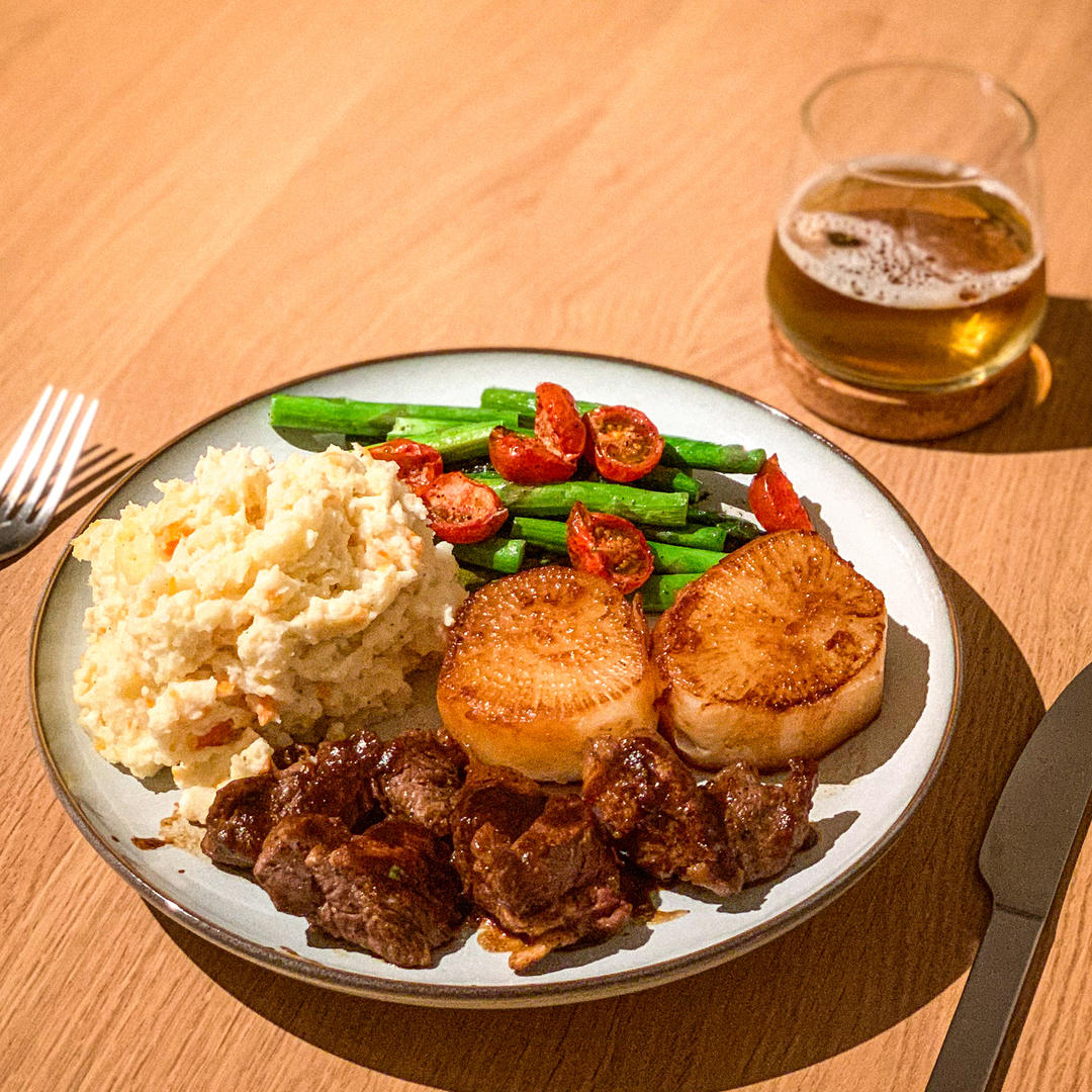 味增醬牛梅頭,燒大根,薯仔沙律,蘆筍番茄仔~加一杯拉格啤🍺