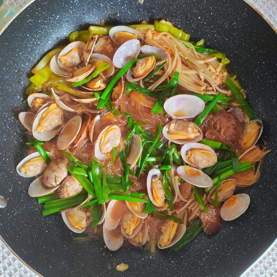 花甲粉丝。不太吃辣,没有放豆瓣酱,放了蒜蓉辣酱,小米辣也改成了青皮辣椒。可能是没爆炒,加水焖出来的,吃起来不是很香。