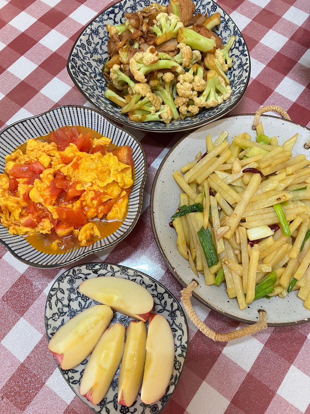 今日午餐:番茄炒蛋、酸辣土豆丝、有机花菜炒肉片。