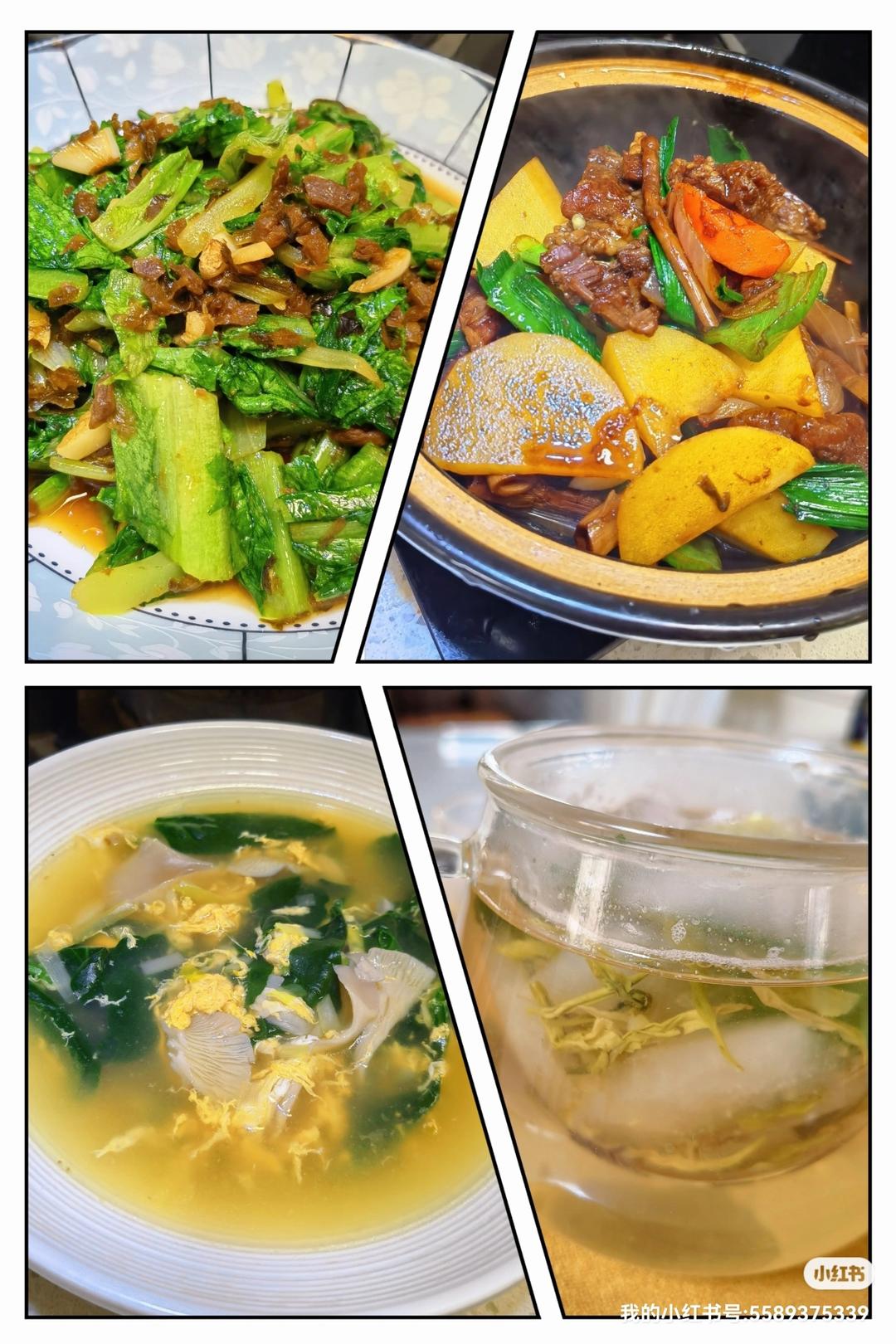 今日午餐:外婆菜炒油麦菜,土豆炖牛筋,蘑菇菠菜蛋汤,白茶梨水,米饭。