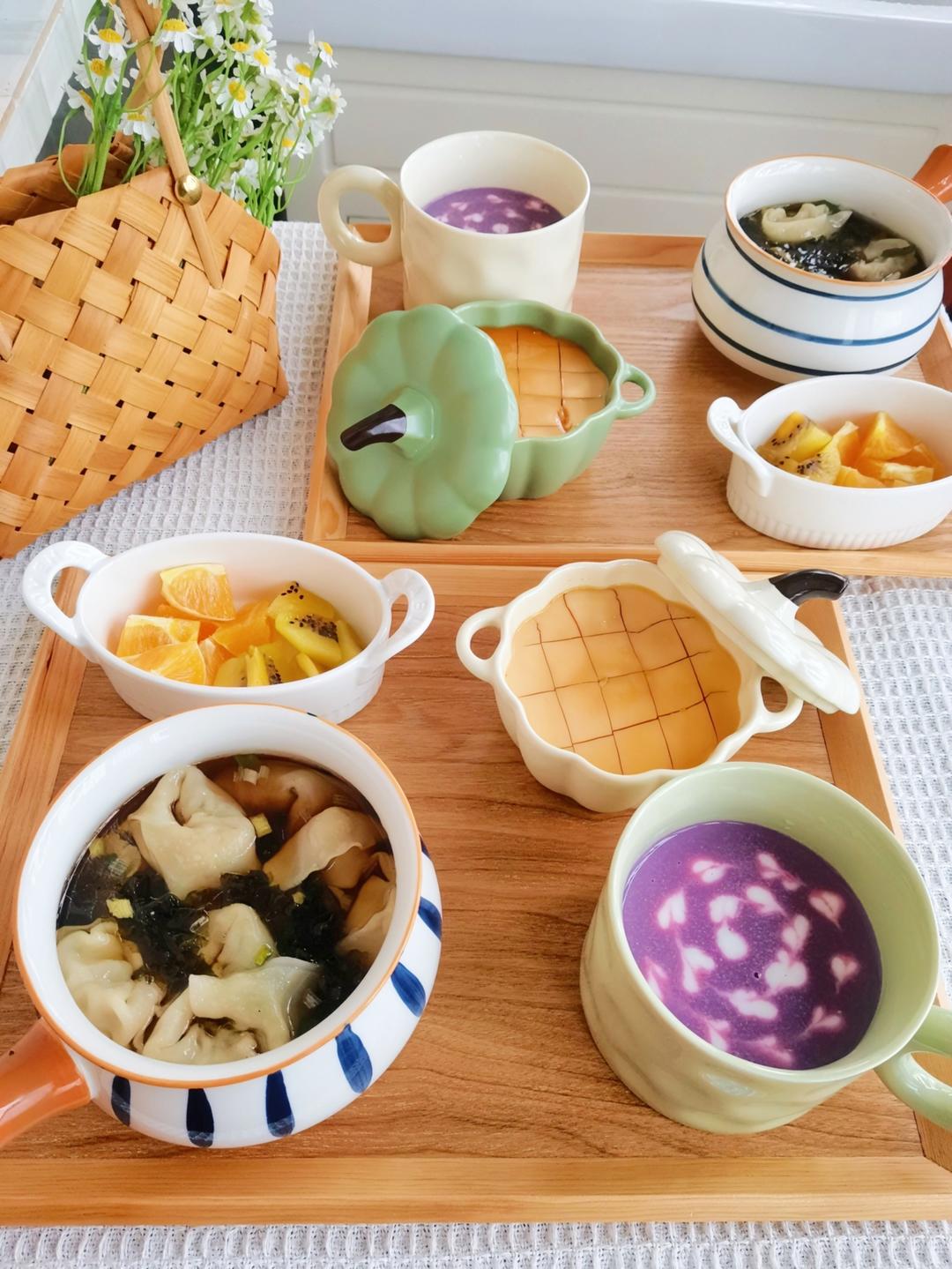 三鲜混沌、水蒸蛋、橙子猕猴桃、紫薯燕麦糊