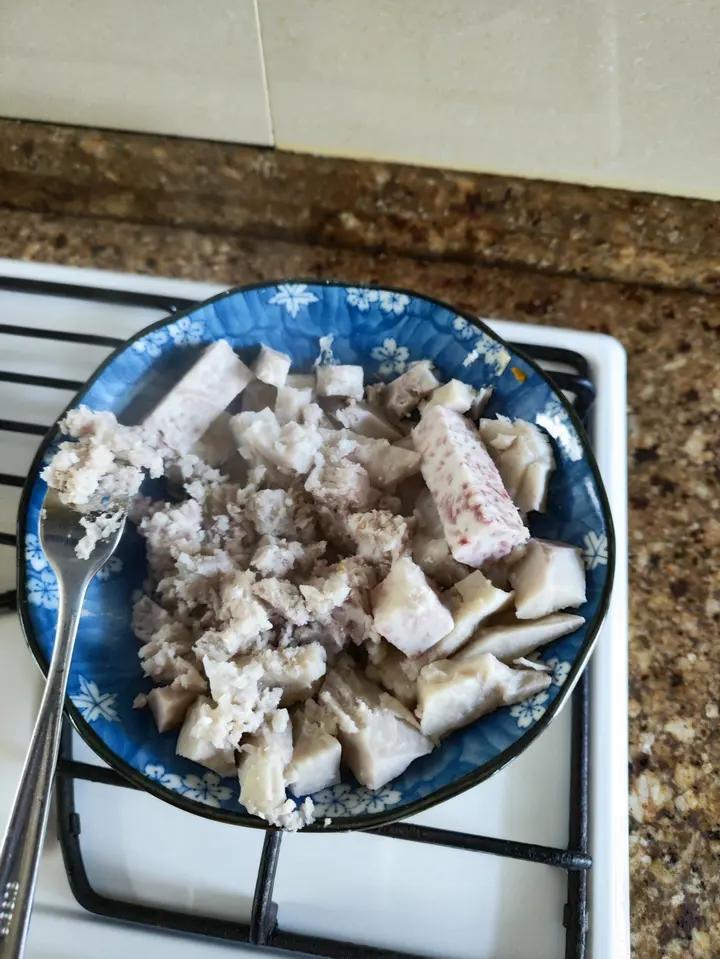 买的去死芋头块,切小条,蒸锅上汽蒸15分钟,叉子可以轻松碾碎。没加炼乳,有350g芋头➕140ml椰浆。三分甜。