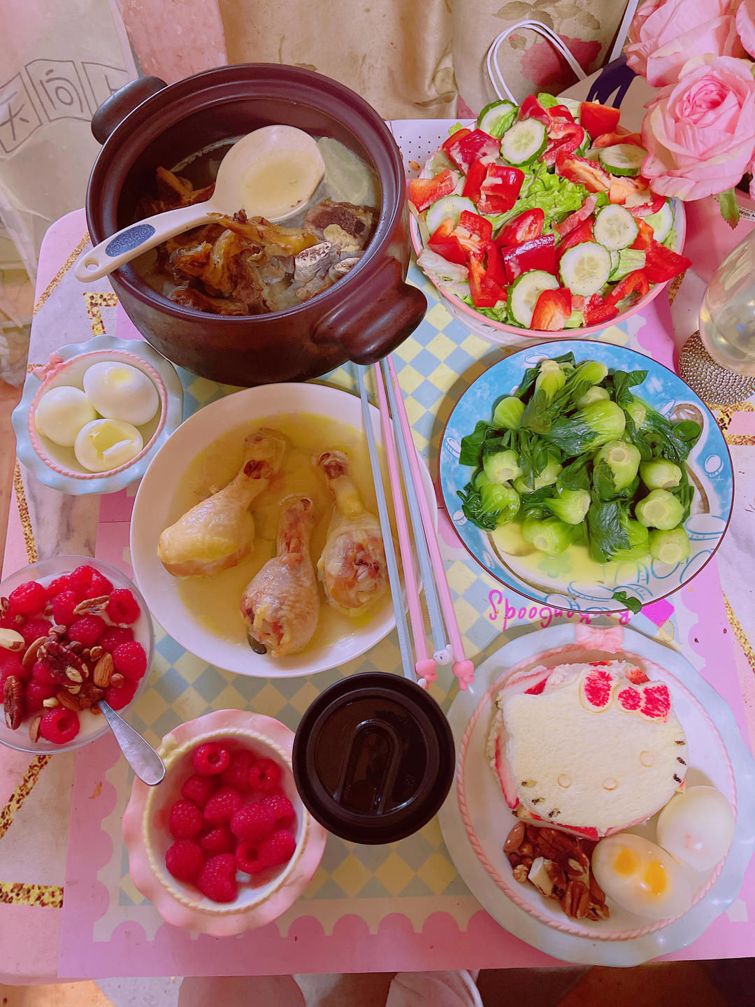 囡爷爱撸铁 做过 早餐•2023年12月9日 #早餐•2023年12月9日# 早安:牛排萝卜汤,鸡腿,色拉,青菜,拿铁,海鸭蛋,鸡蛋白,非洲雁蛋,酸奶燕麦树莓坚果,草莓奶酪KT吐司 2023-12-09