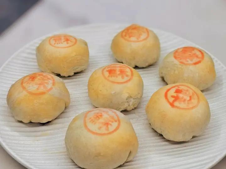 先觉笑笑生 做过 2024年02月15日 水油皮:中筋粉110g猪油35g沸水60g油酥:低筋粉90g猪油45g以上冷藏三十分钟大包酥手法(水油皮包油酥擀开,三折叠,擀开再三折叠,最后擀开从长边卷起来,变成长条,切成十份)肉馅32g一份 180℃中层上下火25分钟 2024-02-15